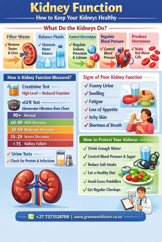 Kidney function refers to how well your kidneys filter blood, remove waste, and keep your body balanced. The kidneys are essential organs that work 24/7 to keep you healthy.